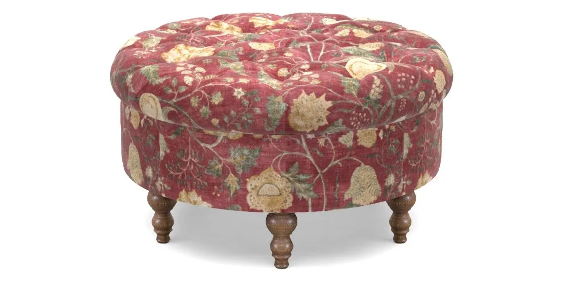 A round, deep-buttoned footstool design that provides a comfortable spot for resting feet or serving a tray of tea. A stylish and practical addition to any space.