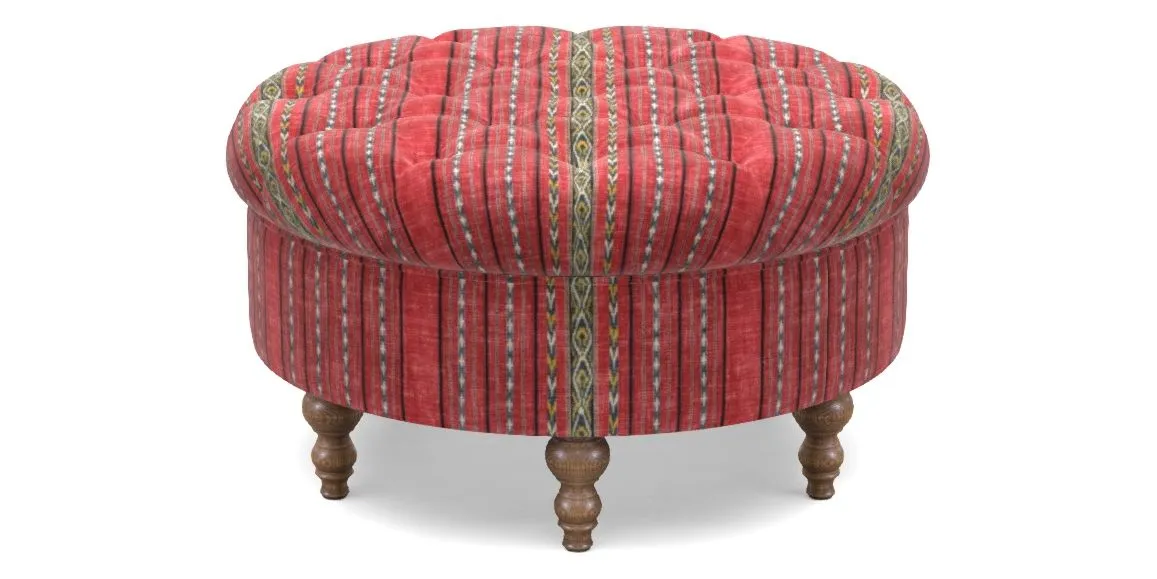 A round, deep-buttoned footstool design that provides a comfortable spot for resting feet or serving a tray of tea. A stylish and practical addition to any space.