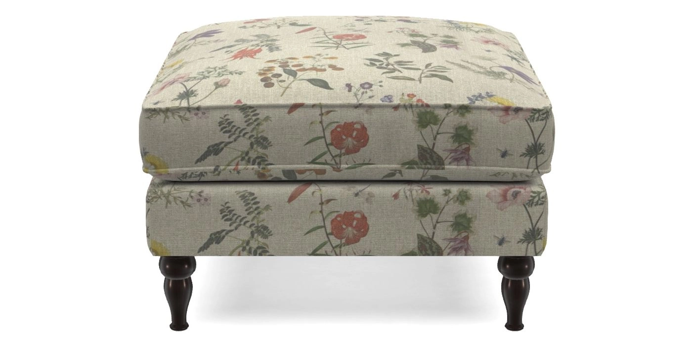 A square, deeply padded footstool with turned legs and castors, offering classic style with practicality. View other products in this range.