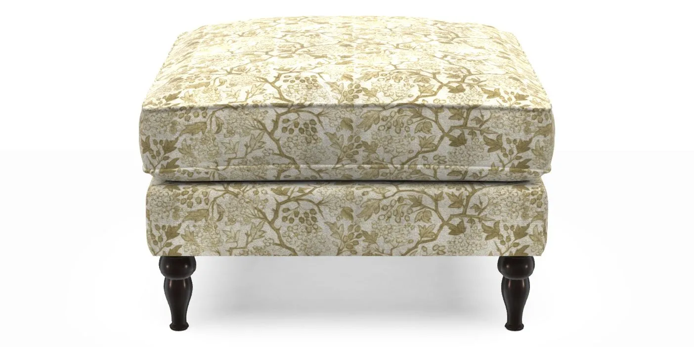 A square, deeply padded footstool with turned legs and castors, offering classic style with practicality. View other products in this range.