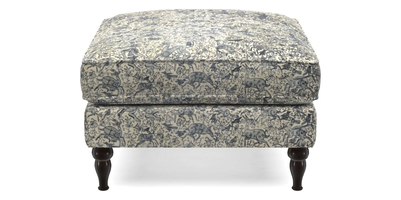 A square, deeply padded footstool with turned legs and castors, offering classic style with practicality. View other products in this range.