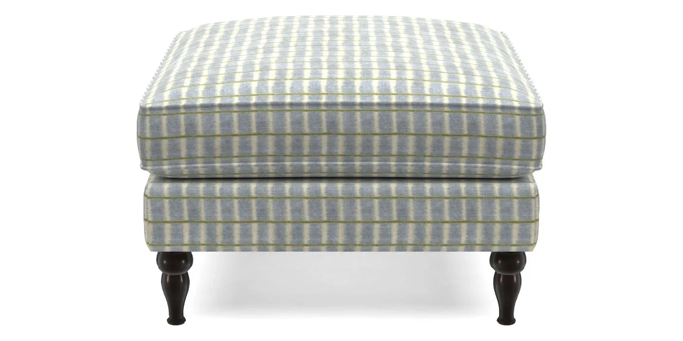 A square, deeply padded footstool with turned legs and castors, offering classic style with practicality. View other products in this range.