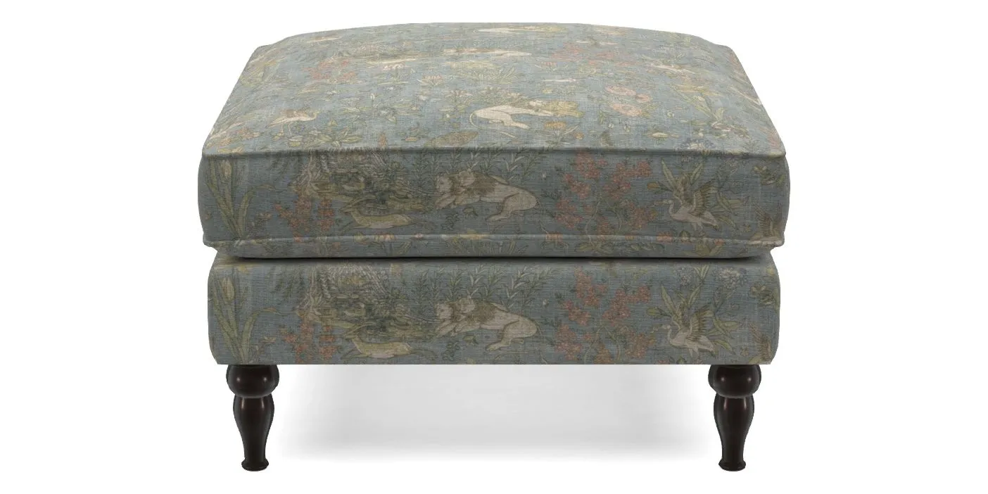 A square, deeply padded footstool with turned legs and castors, offering classic style with practicality. View other products in this range.