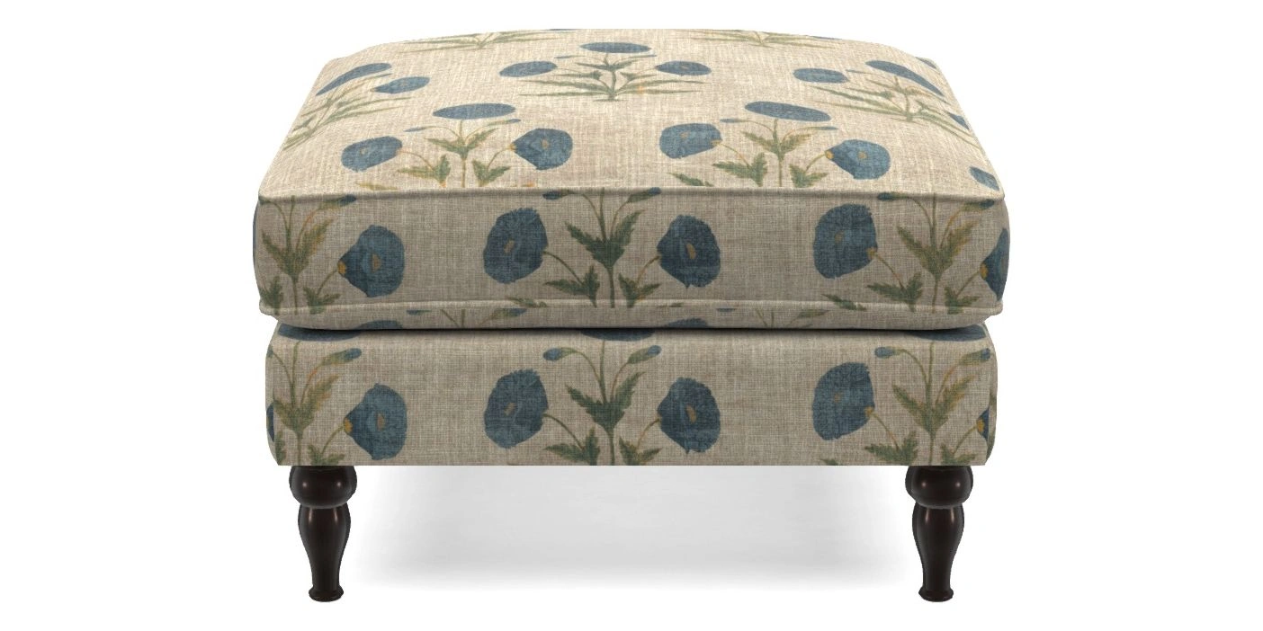 A square, deeply padded footstool with turned legs and castors, offering classic style with practicality. View other products in this range.