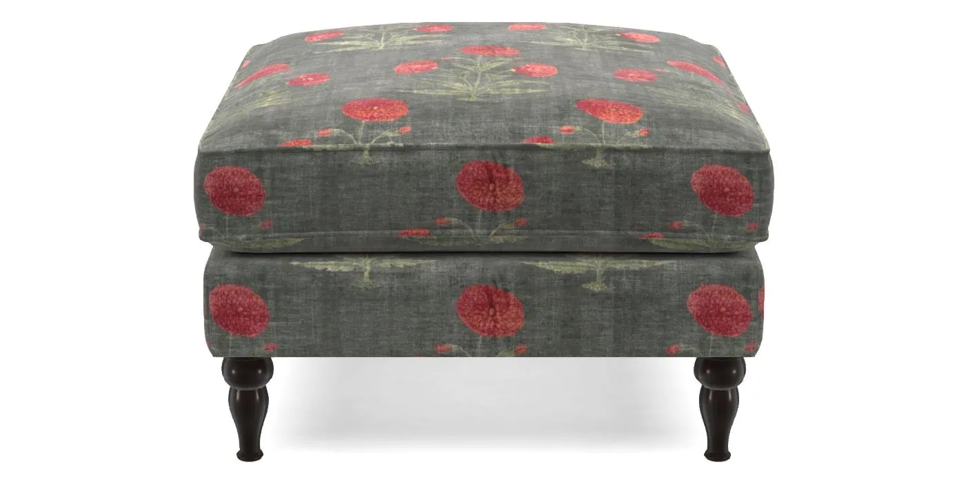 A square, deeply padded footstool with turned legs and castors, offering classic style with practicality. View other products in this range.