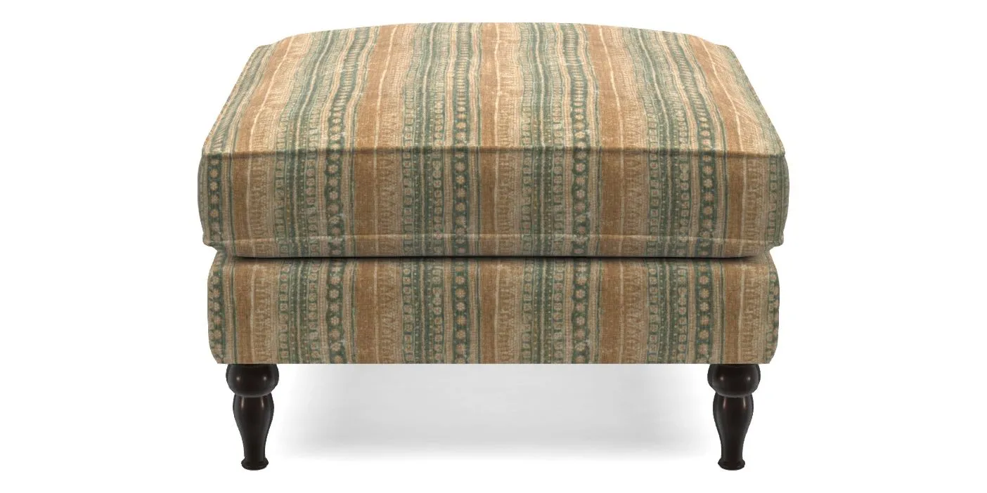 A square, deeply padded footstool with turned legs and castors, offering classic style with practicality. View other products in this range.