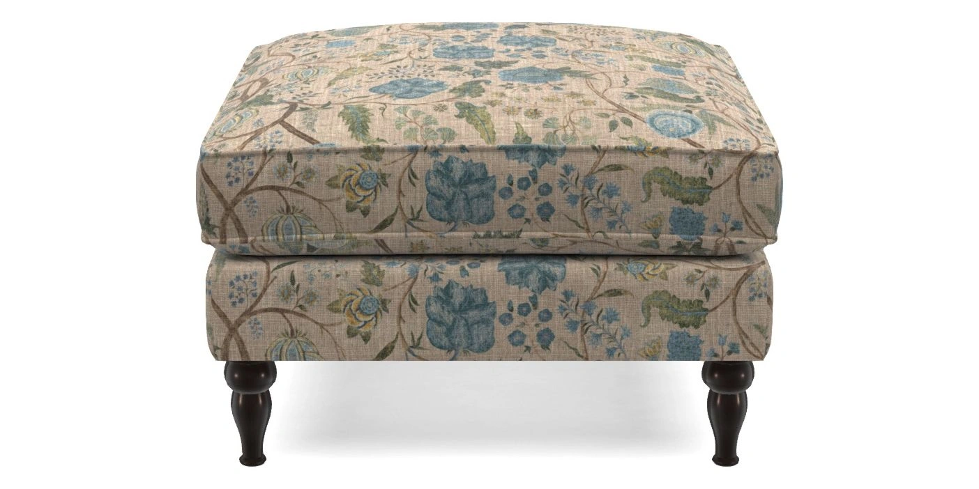 A square, deeply padded footstool with turned legs and castors, offering classic style with practicality. View other products in this range.