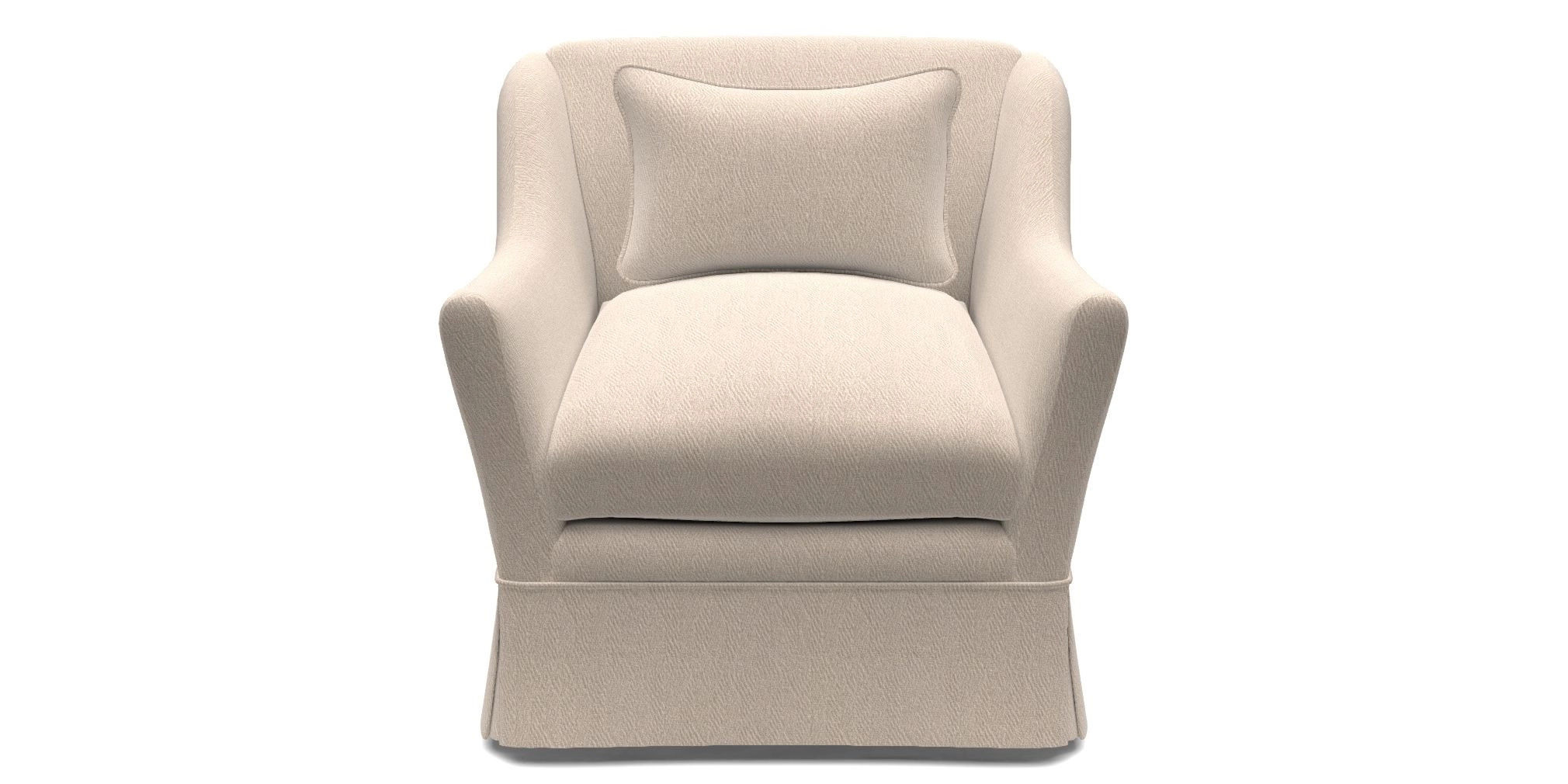 Elegant and inviting, with narrow, dipped arms that subtly turn outwards, and a low, gently sloping sprung back, offering a contemporary twist on classic comfort. Generous, deep-cushioned seat, with two wide scatter cushions for additional comfort.