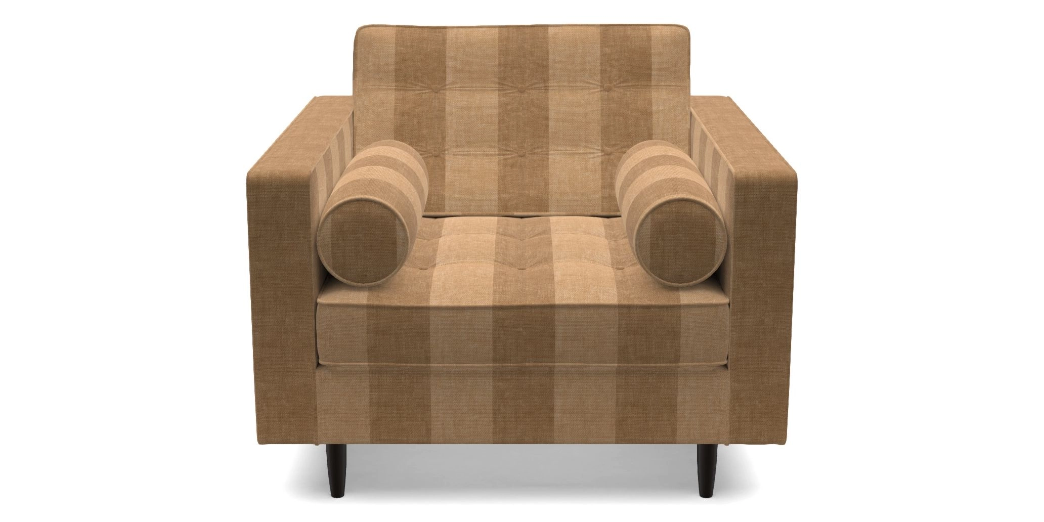 The Marylebone typifies mid-century design with clean square lines, buttoning, and low square arms. Its angular silhouette is complemented by a deep comfy seat and round bolster cushions, offering a chic yet comfortable seating option.