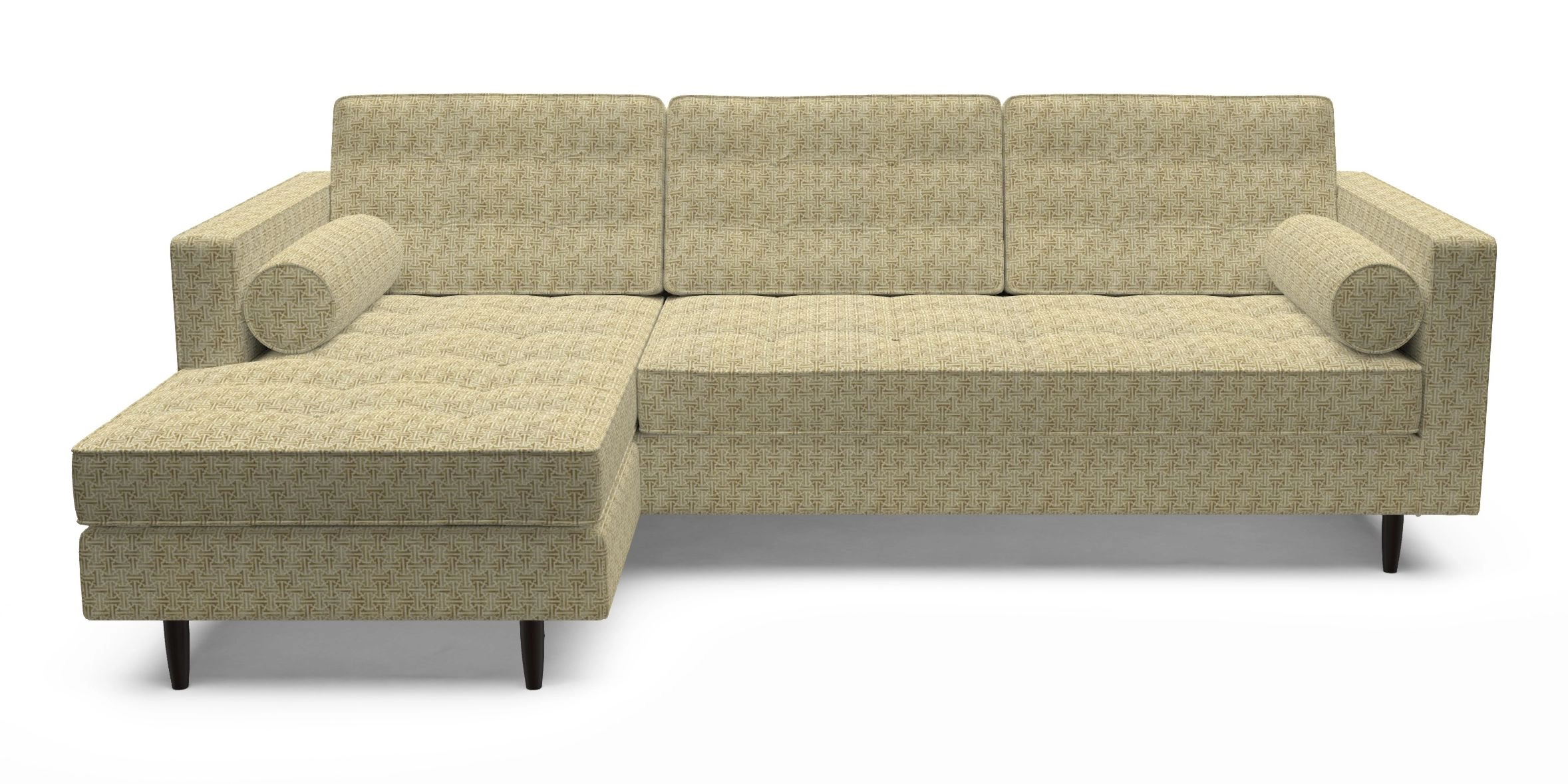 The Marylebone typifies mid-century design with clean square lines, buttoning, and low square arms. Its angular silhouette is complemented by a deep comfy seat and round bolster cushions, offering a chic yet comfortable seating option.