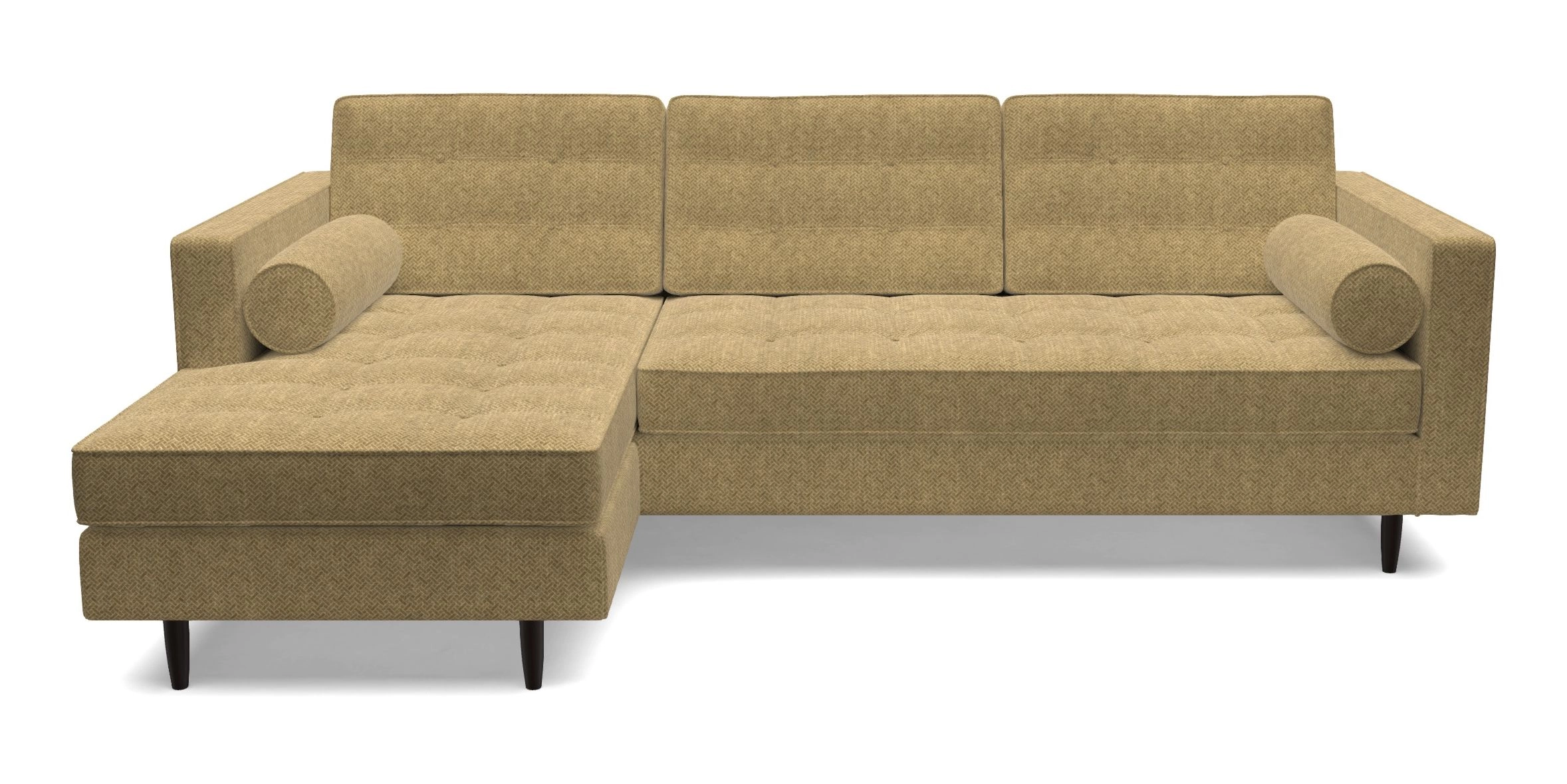The Marylebone typifies mid-century design with clean square lines, buttoning, and low square arms. Its angular silhouette is complemented by a deep comfy seat and round bolster cushions, offering a chic yet comfortable seating option.